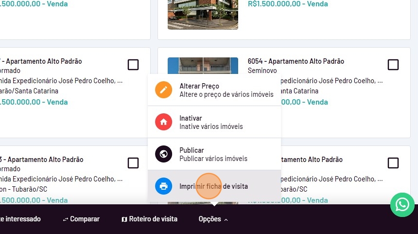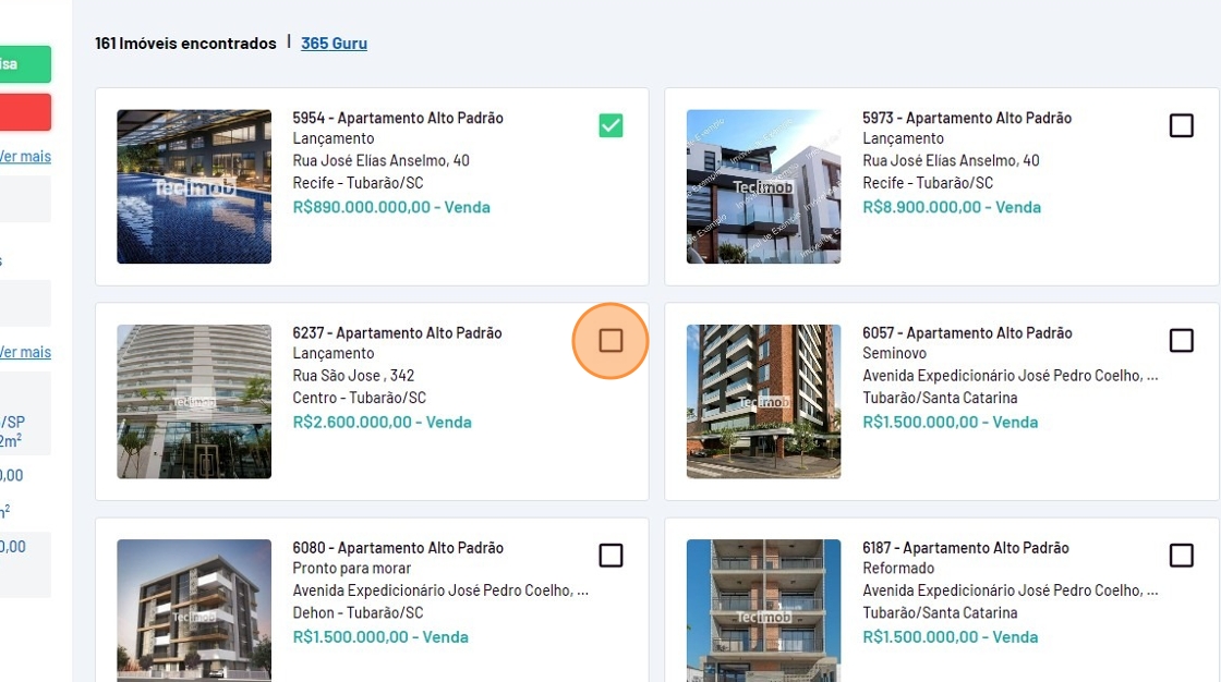 - Siga os passos 1 e 2 para pesquisar pelos imóveis desejados e clique sobre a caixinha de seleção para selecionar os imóveis.