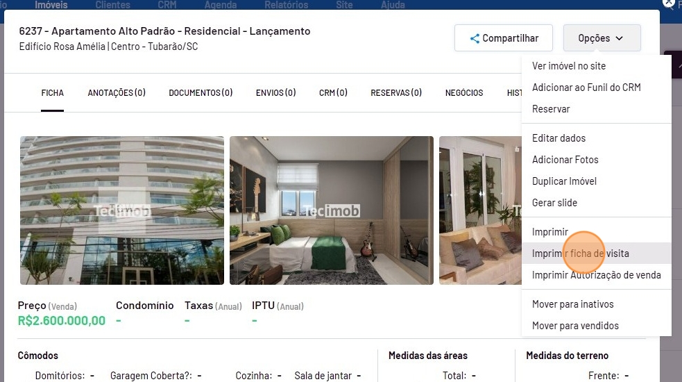 - Após encontrar o imóvel desejado, clique sobre ele e passe o mouse em "Opções". Selecione então a opção "Imprimir ficha de visita".