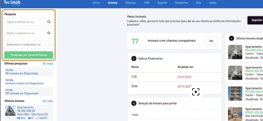 - Utilize o menu do canto esquerdo e pesquise pelos imóveis desejados por "Código de referência" OU por "Logradouro" OU por "Condomínio" OU por "Características".