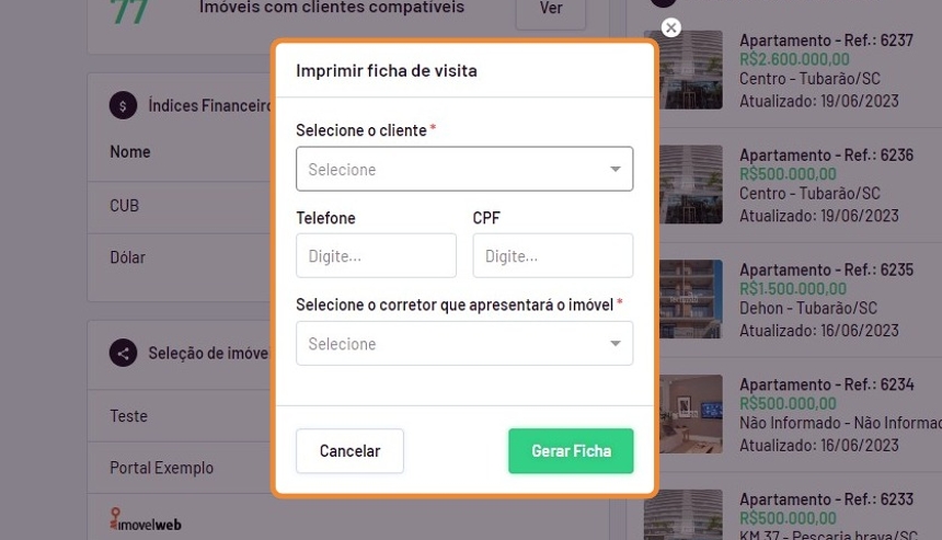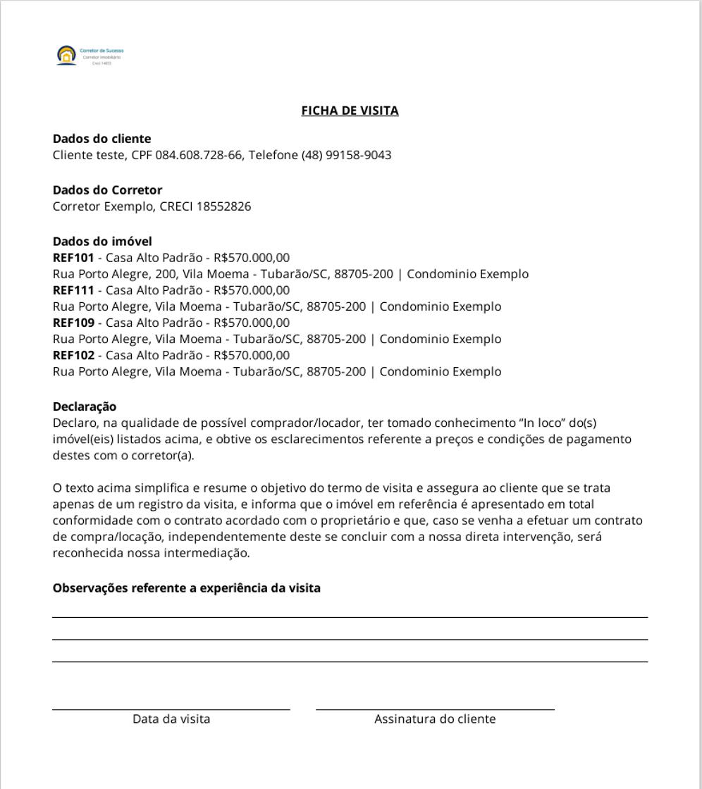 - Será gerado então um PDF da ficha de visita com os dados do corretor, dos imóveis selecionados e do cliente, assim como a declaração e um campo para realizar observações sobre a experiência do cliente.