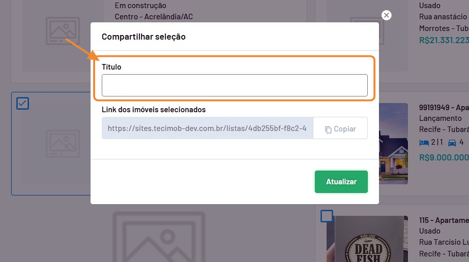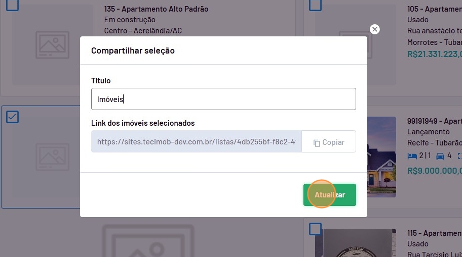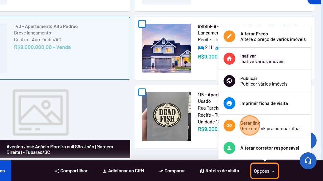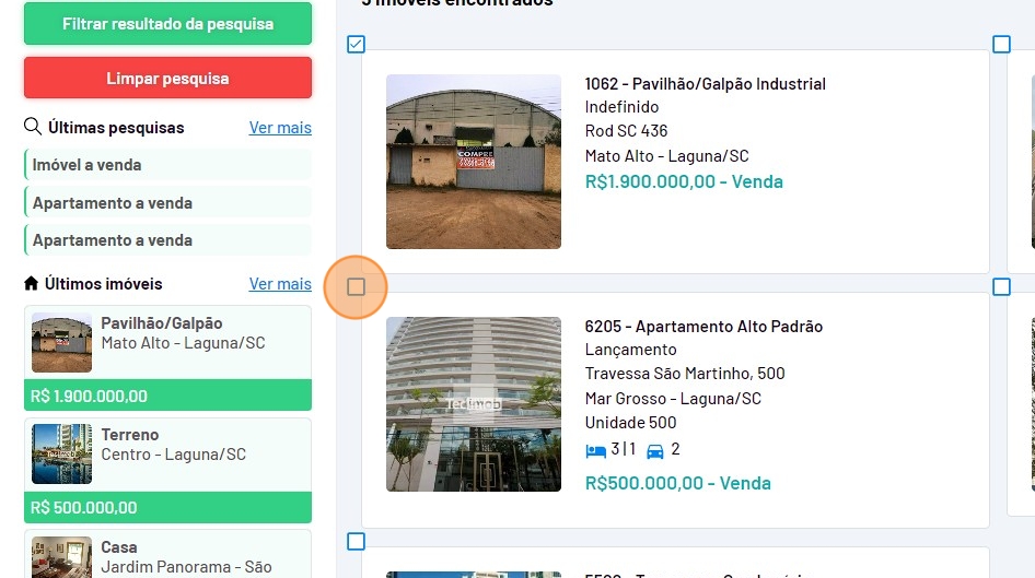 - Selecione-os clicando na caixinha de seleção presente no canto superior direito dos imóveis.