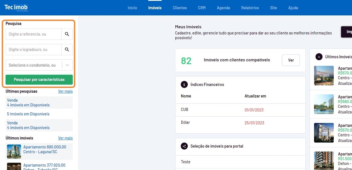 - Utilize o menu do canto esquerdo e pesquise pelos imóveis desejados por "Código de referência" OU por "Logradouro" OU por "Condomínio" OU por "Características".