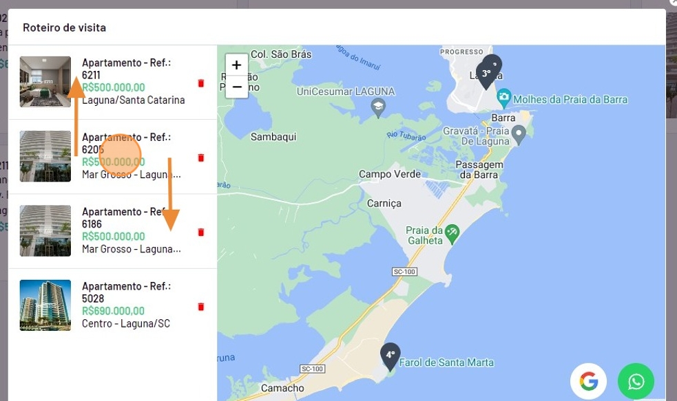 - Defina a ordem do roteiro, clicando no imóvel e arrastando (para cima e para baixo).