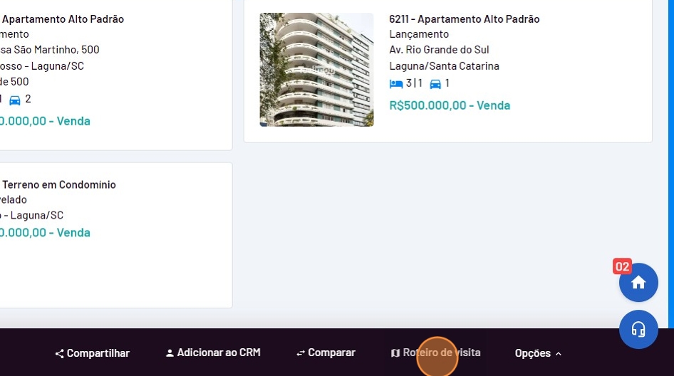 - Selecione os imóveis clicando sobre a caixinha de seleção no canto superior direito dos imóveis.