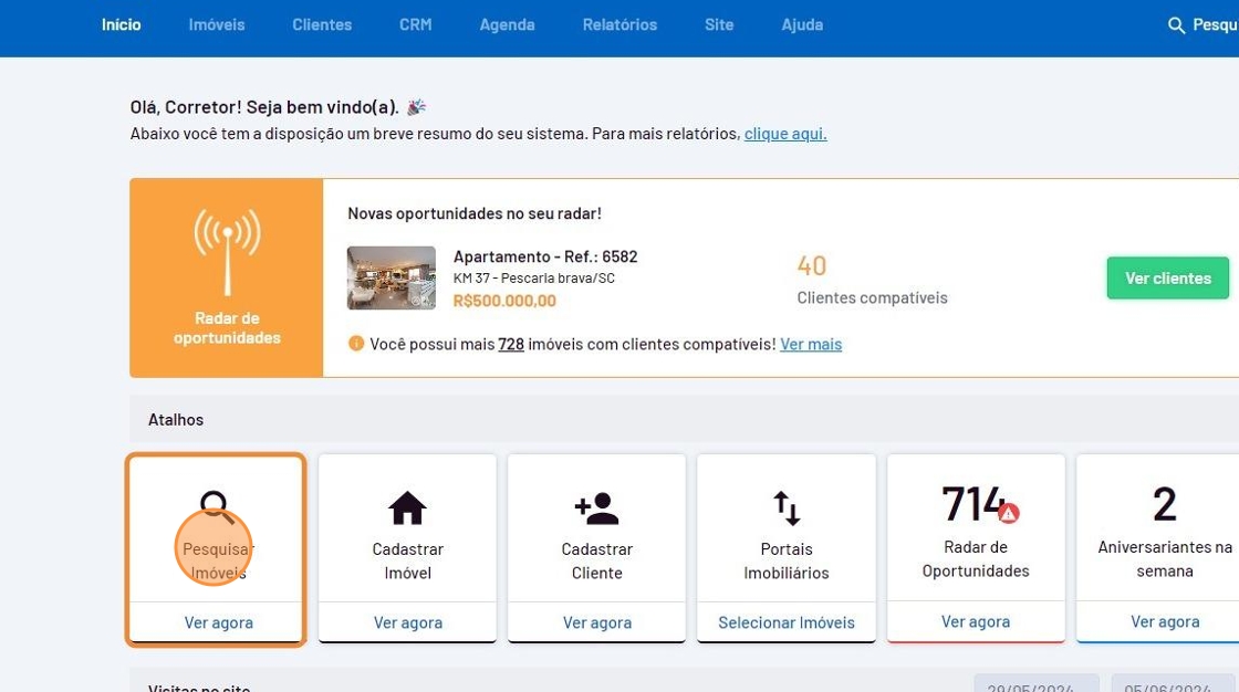 - Na tela inicial do sistema, clique no atalho "Pesquisar Imóveis".