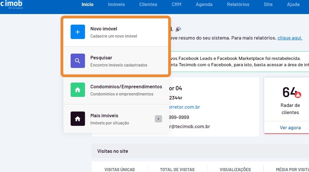 - No menu "Imóveis", clique em "Novo imóvel" para cadastrar um novo imóvel ou clique em "Pesquisar" para encontrar o imóvel desejado.