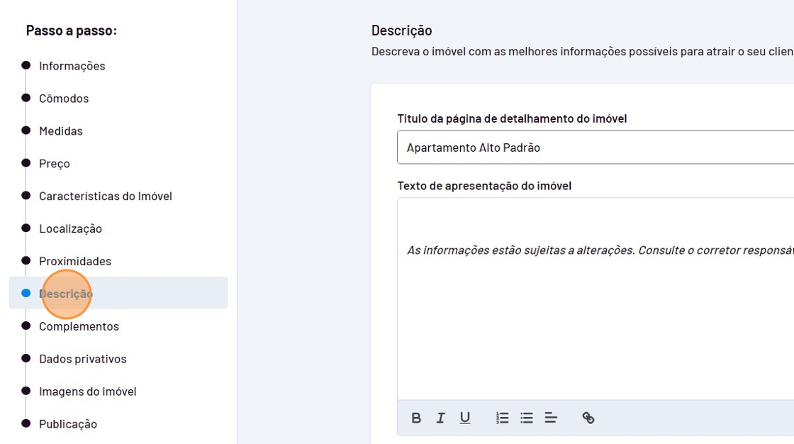 - Na ficha de cadastro do imóvel, clique na etapa "Descrição".