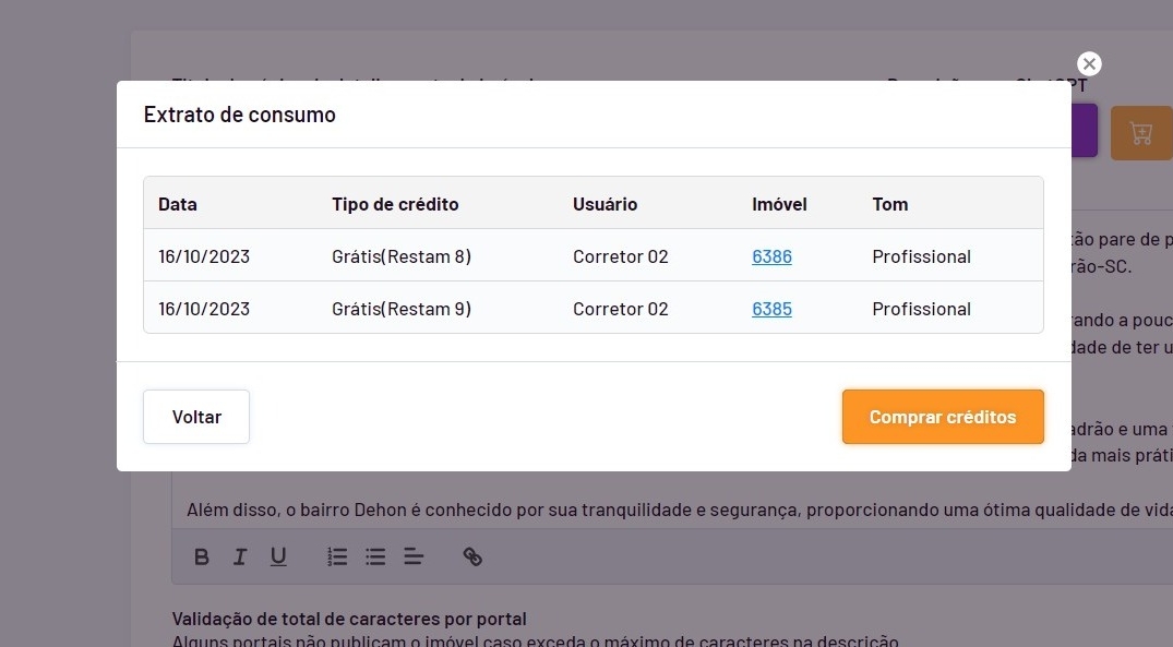 - Visualize as descrições que você já gerou, com a data, tipo de crédito, usuário que utilizou, imóvel e o Tom da descrição.