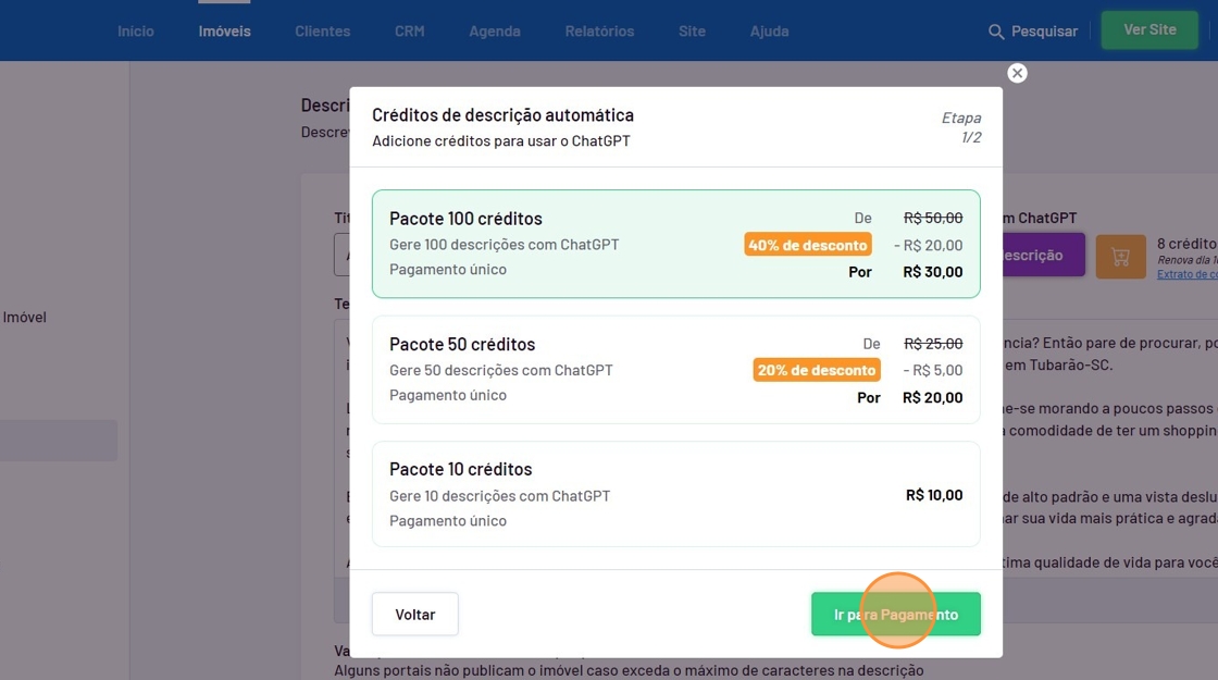 - Selecione o pacote que deseja e clique em "Ir para pagamento".