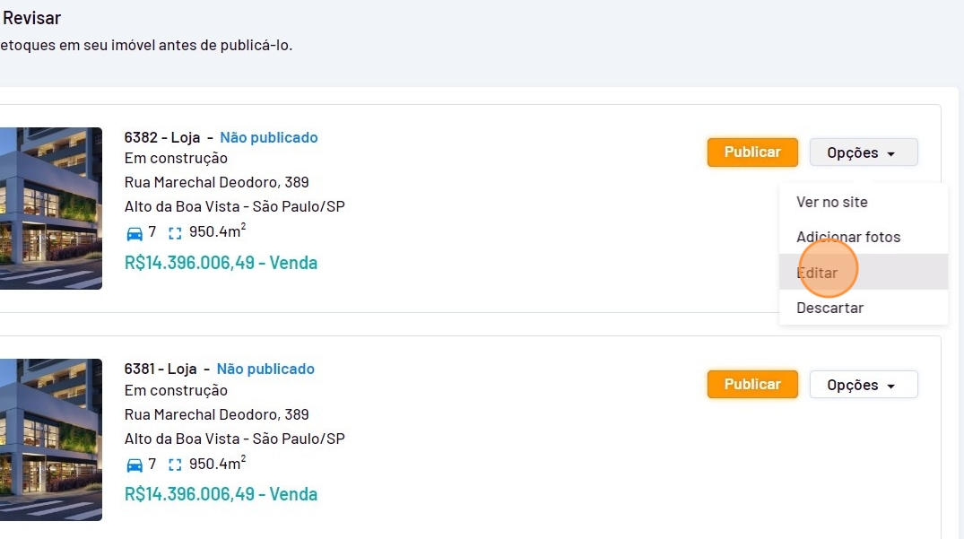 - Edite o imóvel clicando em "Opções" e "Editar".