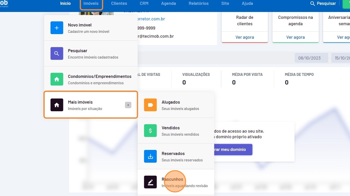 - No menu "Imóveis", passe o mouse em "Mais imóveis" e clique em "Rascunhos".