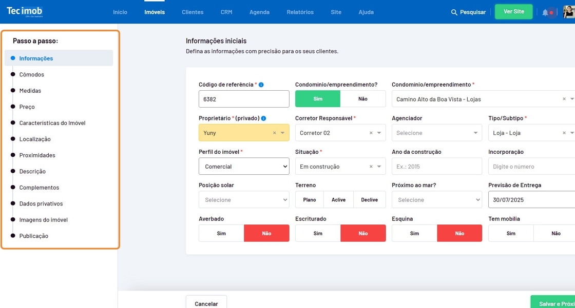 - Navegue pelo menu lateral para ir a área desejada e edite as informações do imóvel.