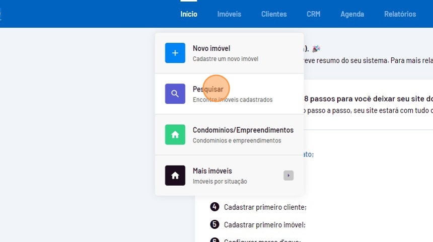 - Passe o mouse sobre o menu "Imóveis" e clique em "Pesquisar".