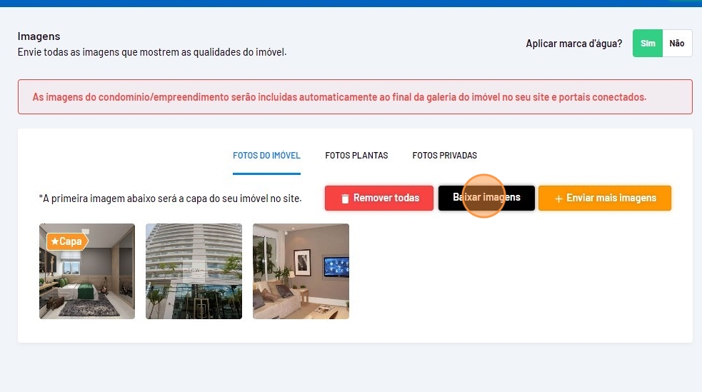 Para baixar as imagens do imóvel no sistema, siga estes passos: