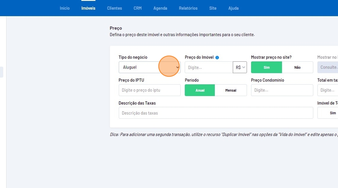 - Selecione o tipo de negócio como "Aluguel".