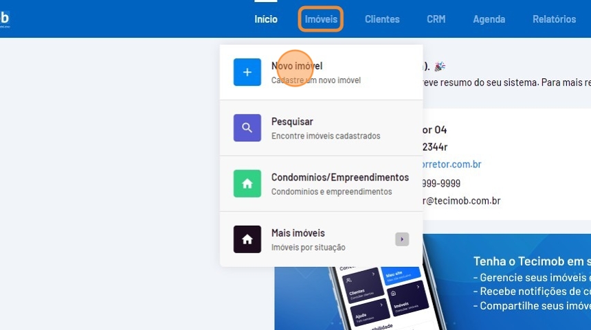 - Passe o mouse sobre o menu "Imóveis" e clique em "Novo imóvel".