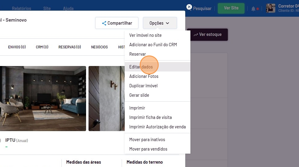 Na ficha do imóvel, passe o mouse em "Opções" e clique em "Editar dados".