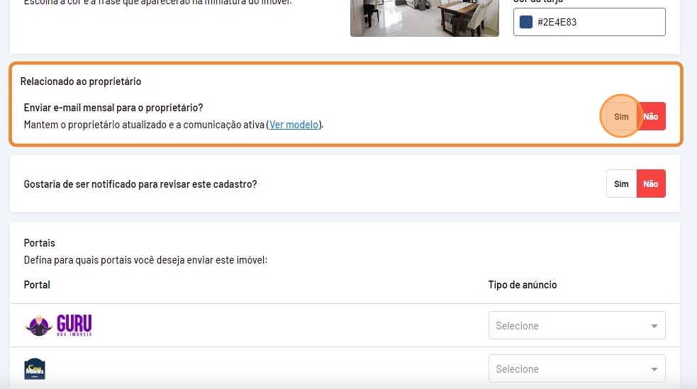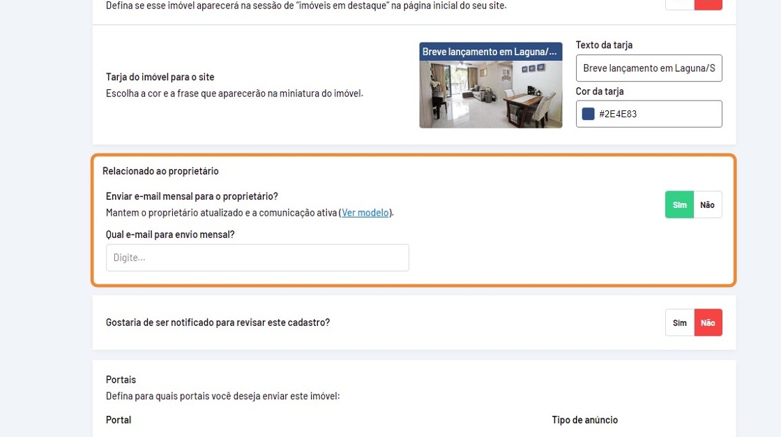 - Selecione “Sim” na opção “Enviar e-mail mensal com resumo de dados para o proprietário?”.