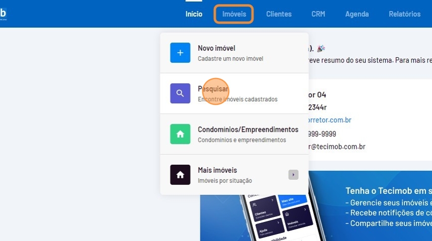 - Passe o mouse sobre o menu "Imóveis" e clique em "Pesquisar".