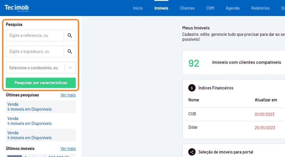 - Utilize o menu do canto esquerdo e pesquise pelos imóveis desejados por "Código de referência" OU por "Logradouro" OU por "Condomínio" OU por "Características".