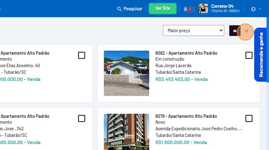 - Altere o formato de visualização dos imóveis para lista clicando no ícone no canto superior direito da tela.