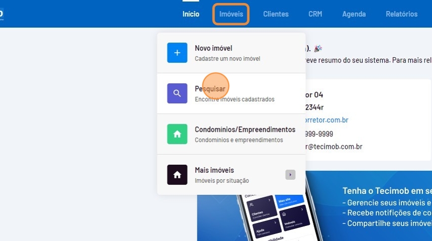 - Passe o mouse sobre o menu "Imóveis" e clique em "Pesquisar".