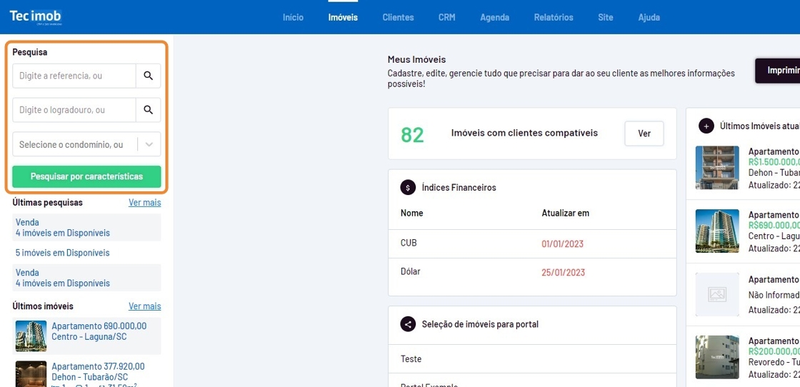 - Utilize o menu do canto esquerdo e pesquise pelos imóveis desejados por "Código de referência" OU por "Logradouro" OU por "Condomínio" OU por "Características".