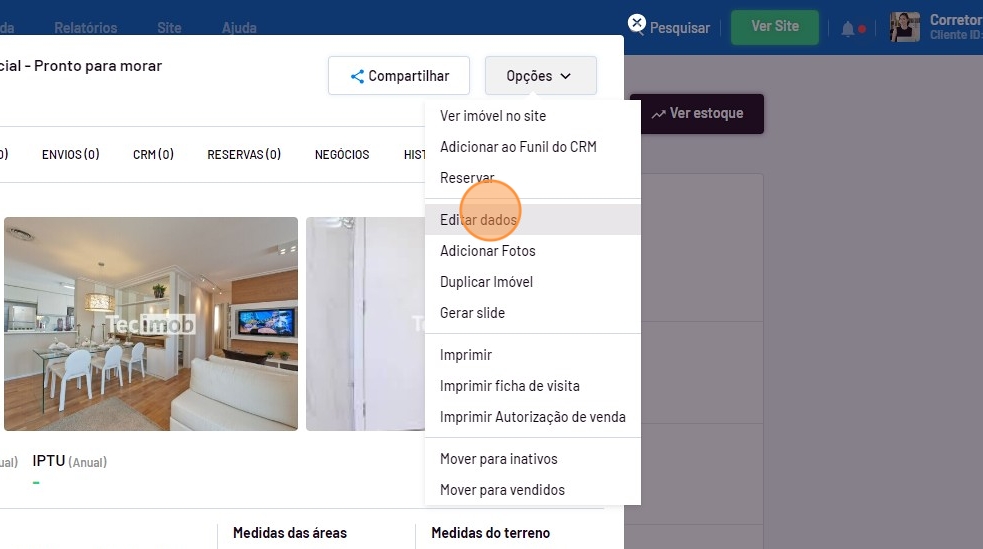 Na ficha do imóvel, passe o mouse em "Opções" e clique em "Editar dados".