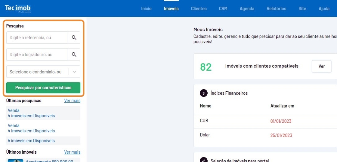 - Utilize o menu do canto esquerdo e pesquise pelos imóveis desejados por "Código de referência" OU por "Logradouro" OU por "Condomínio" OU por "Características".