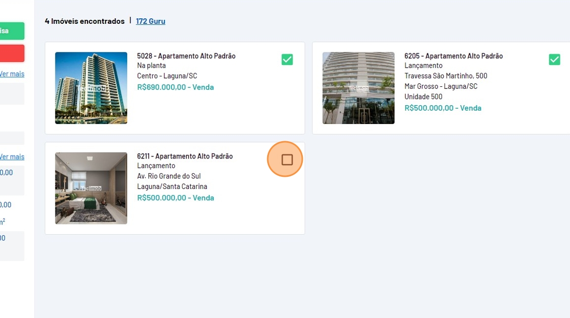 - Selecione os imóveis clicando sobre a caixinha de seleção.