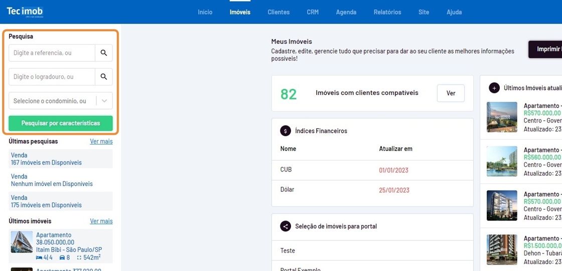 - Utilize o menu do canto esquerdo e pesquise pelos imóveis desejados por "Código de referência" OU por "Logradouro" OU por "Condomínio" OU por "Características".