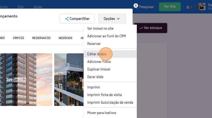 Na ficha do imóvel. passe o mouse em "Opções" e clique em "Editar dados".