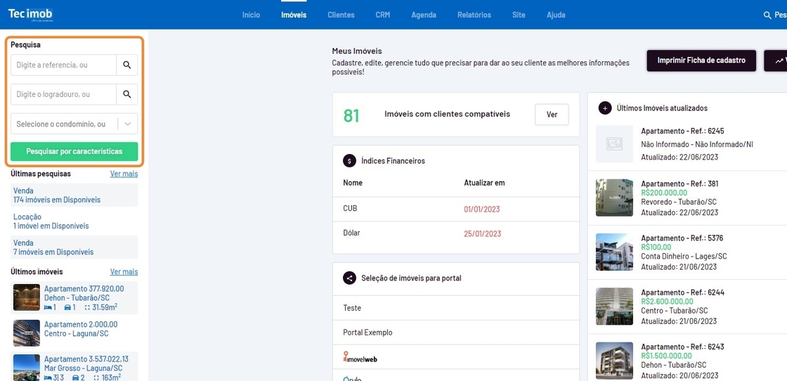 - Utilize o menu do canto esquerdo e pesquise pelos imóveis desejados por "Código de referência" OU por "Logradouro" OU por "Condomínio" OU por "Características".