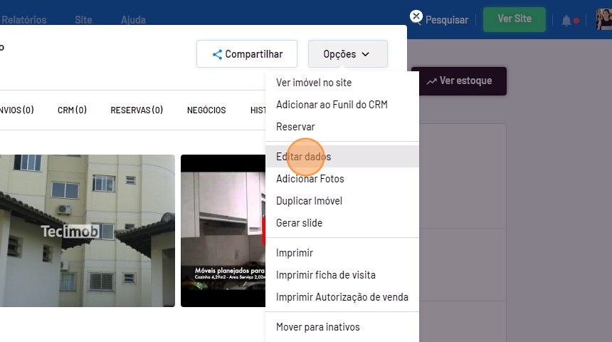 Na ficha do imóvel, passe o mouse em "Opções" e clique em "Editar dados".