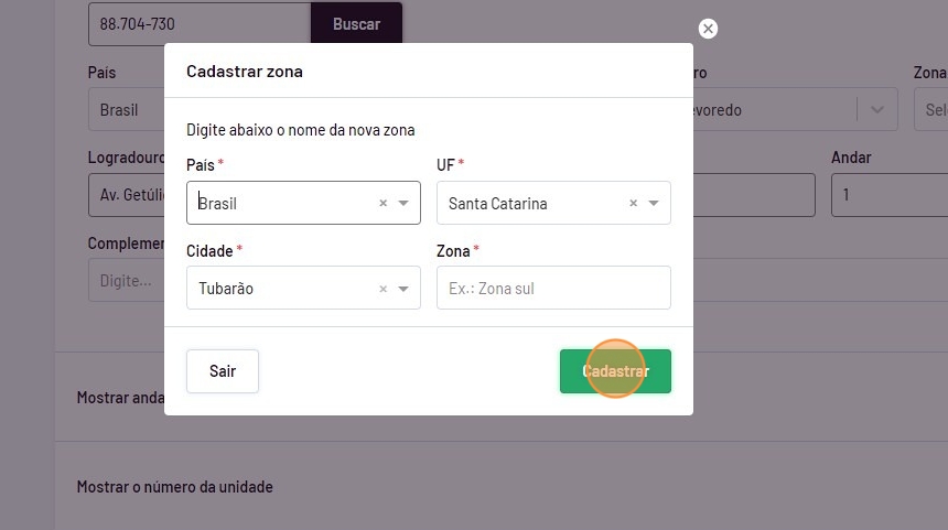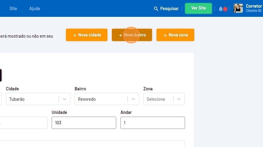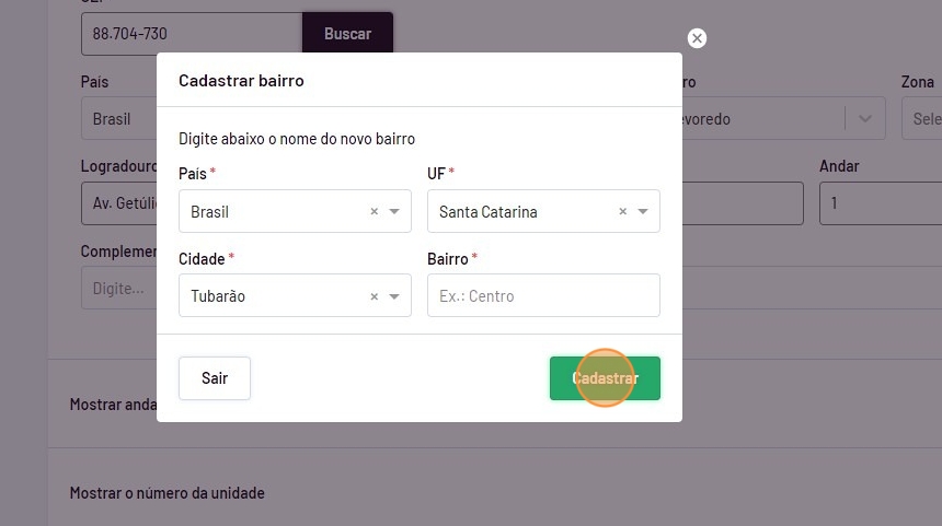 - Preencha as informações do bairro e clique em "Cadastrar".
