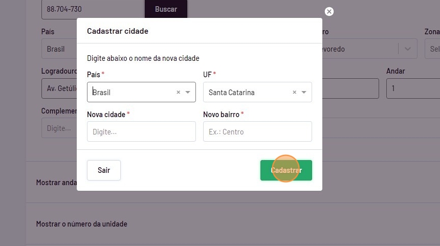 - Preencha as informações da cidade e clique em "Cadastrar".