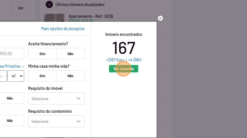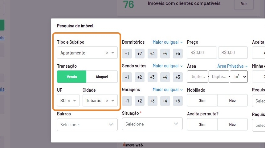 - Obrigatoriamente você deve preencher: Tipo/Subtipo, Transação, UF e Cidade para que seja possível filtrar por imóveis da DWV.