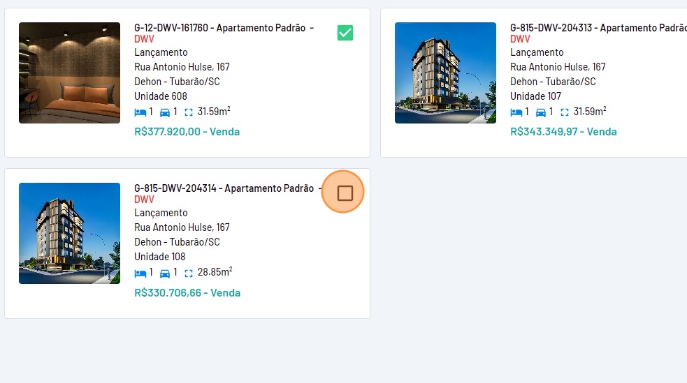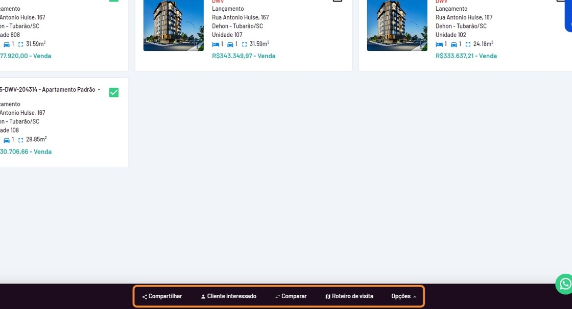- E na barra preta que surgirá abaixo da tela, você terá opções para interagir com os imóveis selecionados.