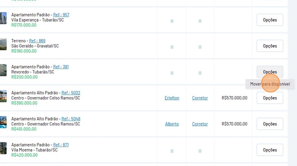 - Após encontrar o imóvel desejado, passe o mouse em "Opções" e clique em "Mover para disponível".