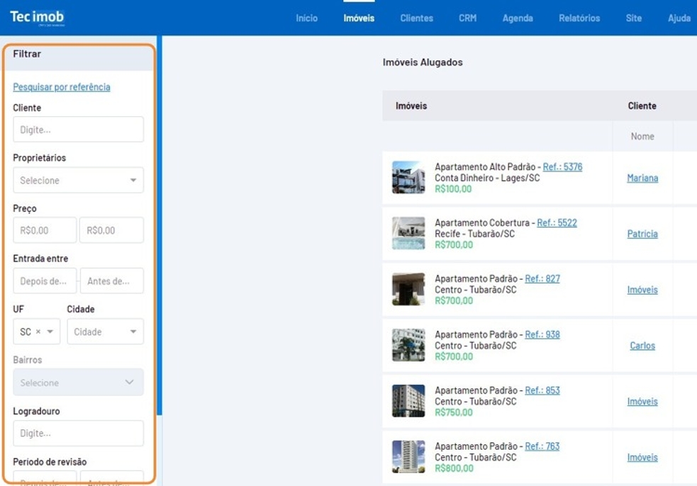 - Utilize o filtro do canto esquerdo da tela para localizar o imóvel.