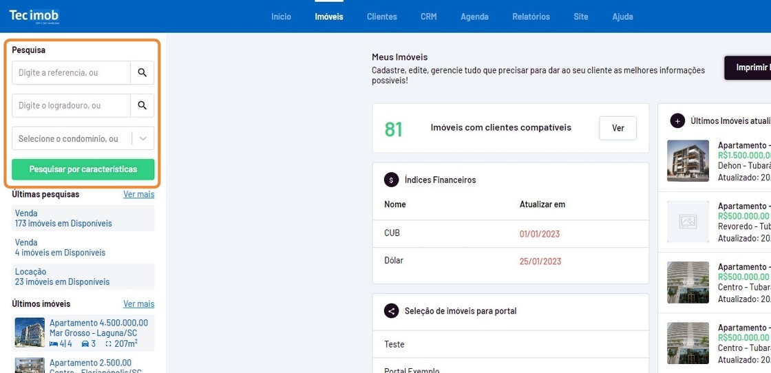 - Utilize o menu do canto esquerdo e pesquise pelos imóveis desejados por "Código de referência" OU por "Logradouro" OU por "Condomínio" OU por "Características".