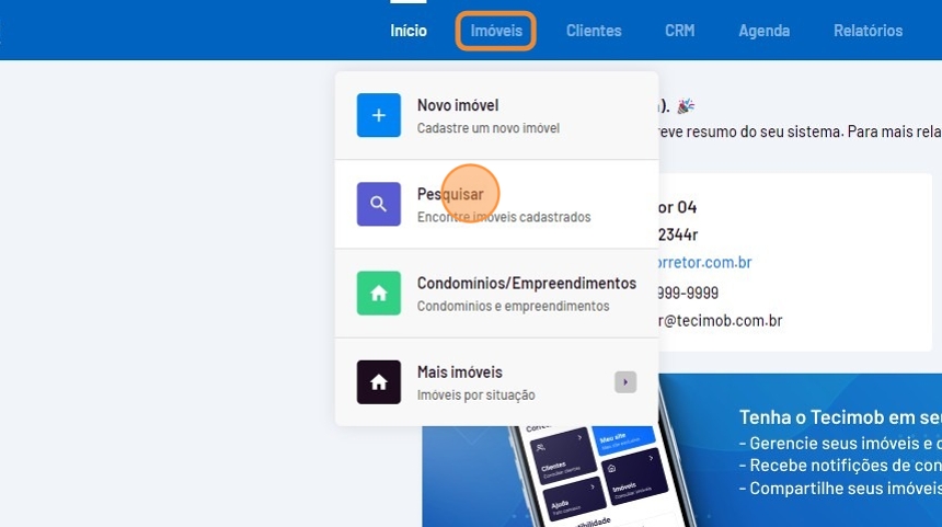 - Passe o mouse sobre o menu "Imóveis" e clique em "Pesquisar".