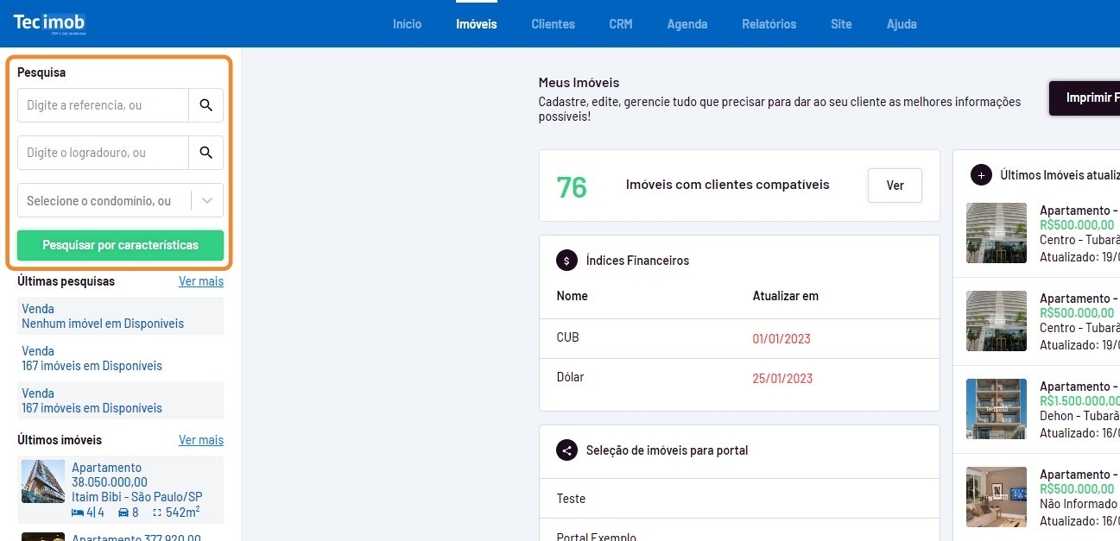 - Utilize o menu do canto esquerdo e pesquise pelos imóveis desejados por "Código de referência" OU por "Logradouro" OU por "Condomínio" OU por "Características".