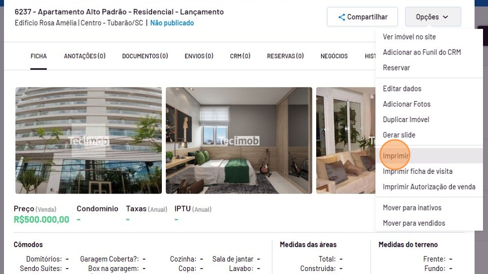 Para imprimir a ficha do imóvel no sistema Tecimob, siga estes passos: