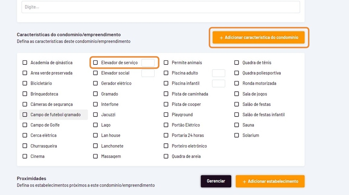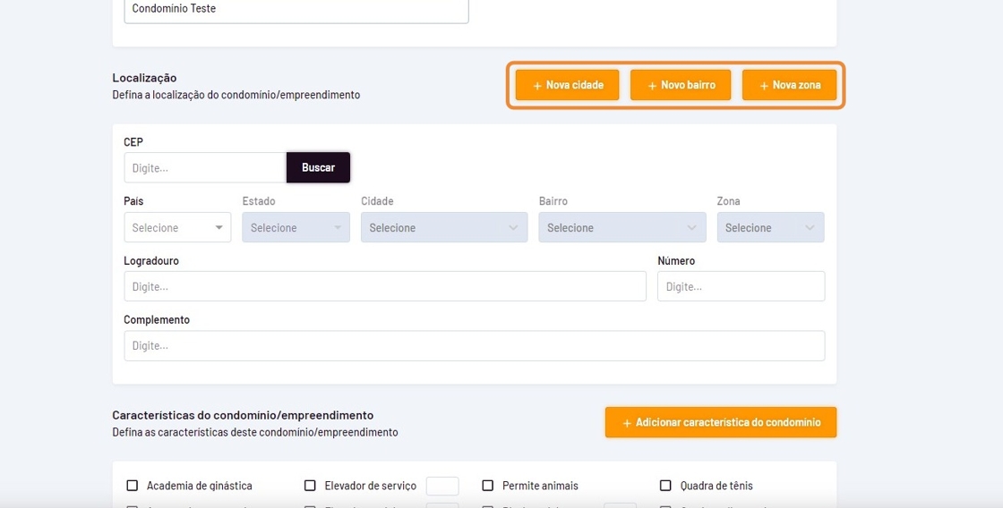 - Selecione as características do condomínio/empreendimento ou cadastre novas características clicando em "Adicionar características do condomínio";