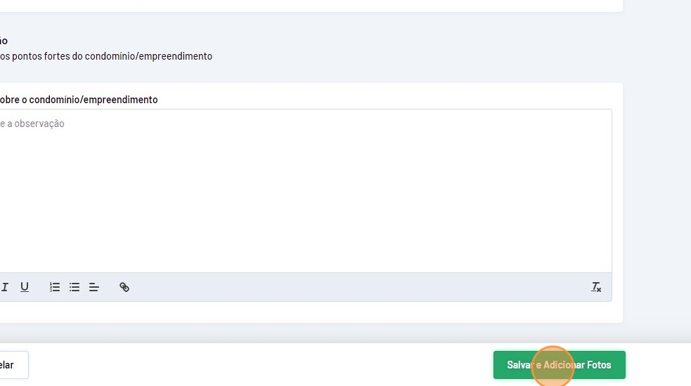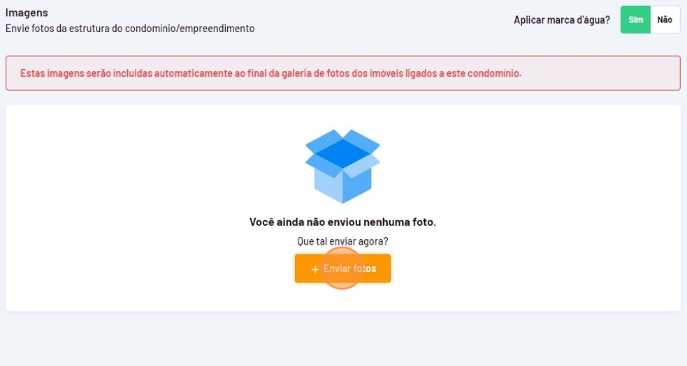 - Para adicionar fotos do condomínio/empreedimento, clique em "Enviar fotos".