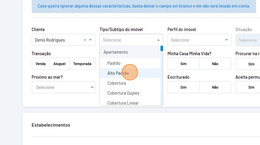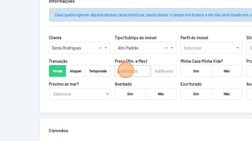 - Selecione o tipo de transação, se o cliente está buscando um imóvel para venda ou locação.