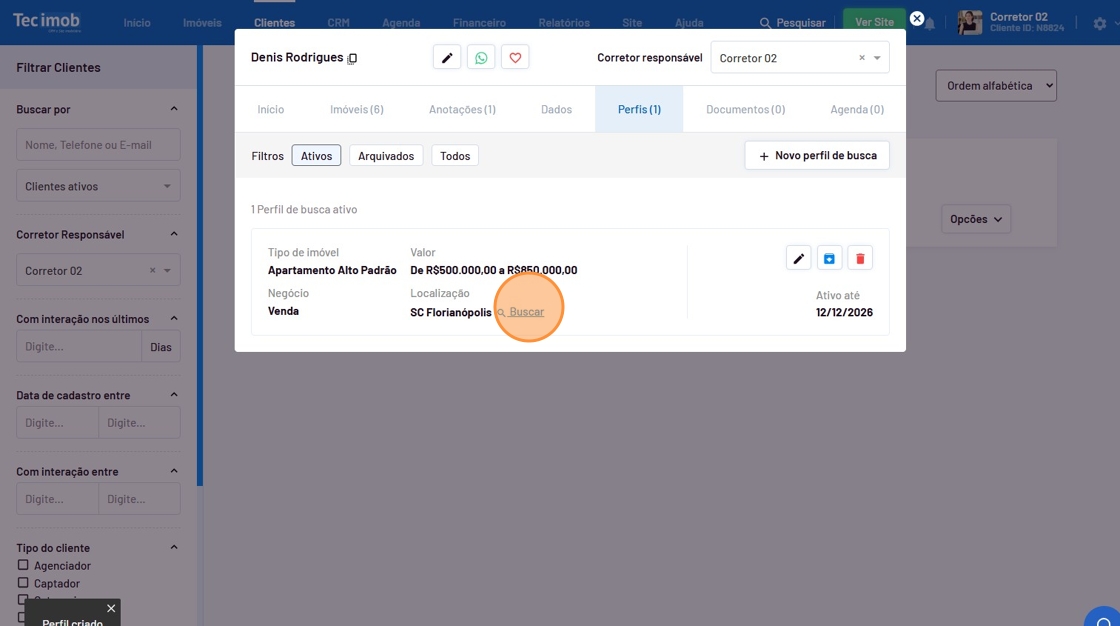- Após cadastrar o perfil, você pode clicar em "Buscar" para ver se em seu sistema existem imóveis cadastrados que são compatíveis com o perfil que você cadastrou.