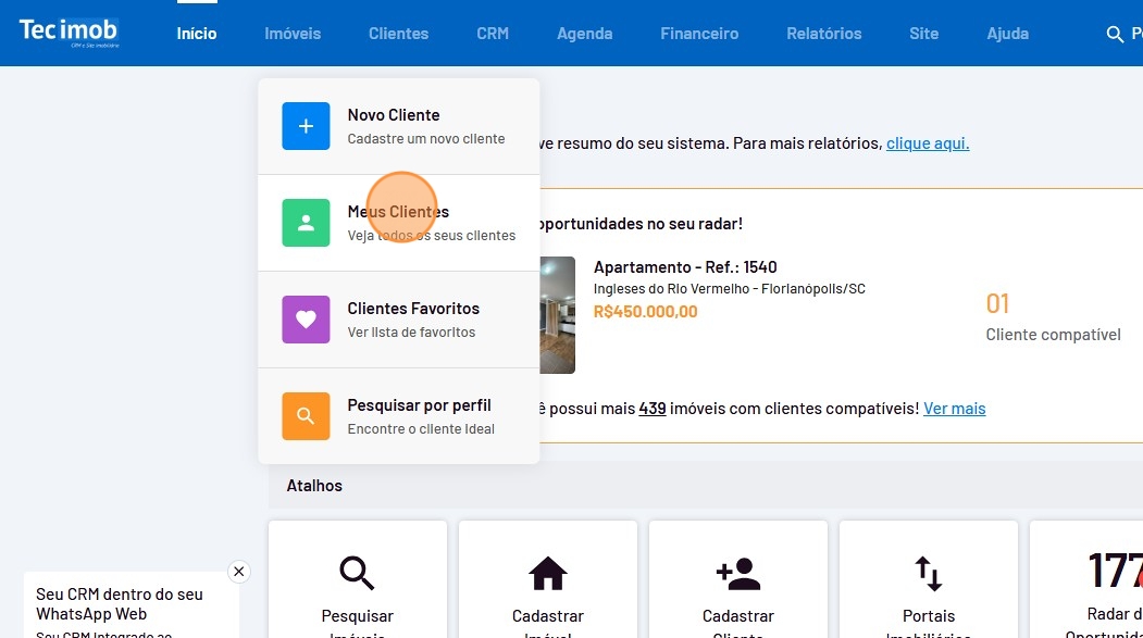 - Passe o mouse sobre o menu "Clientes" e clique em "Meus Clientes".