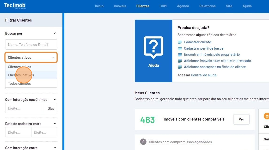 - Em "Meus clientes" selecione o filtro "Clientes inativos" para pesquisar por clientes que você já inativou no sistema.